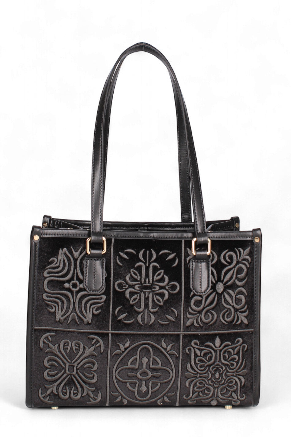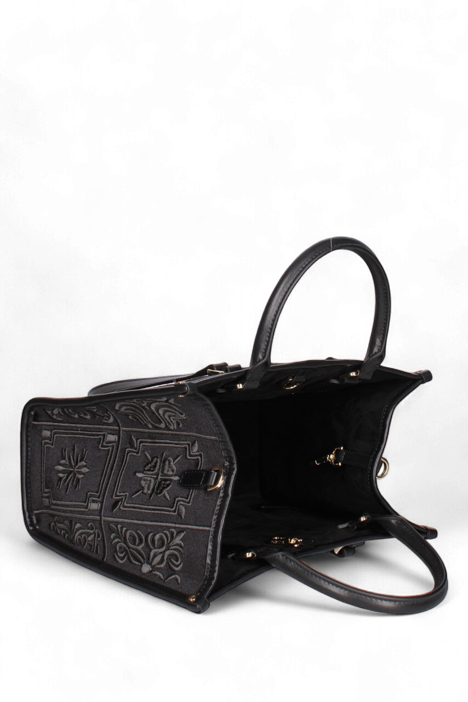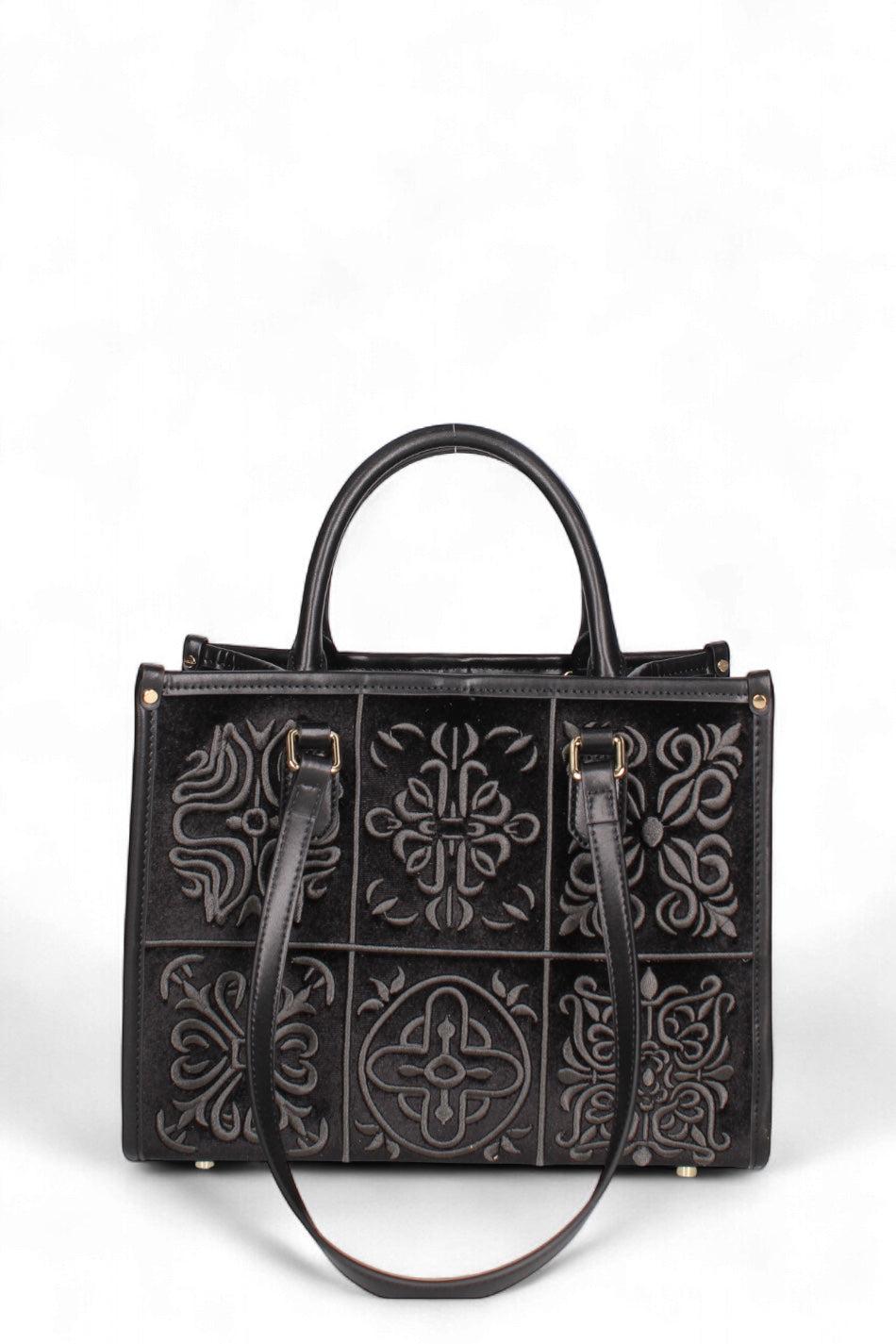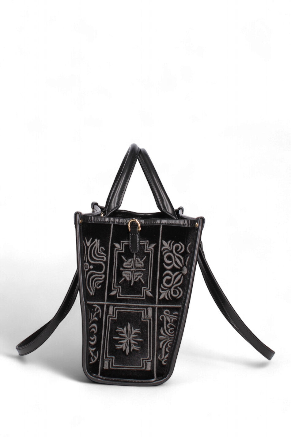 Materiale: Realizzata in velluto con ricami a motivi stilizzati. I bordi, i manici e la tracolla sono rifiniti in vera pelle.
