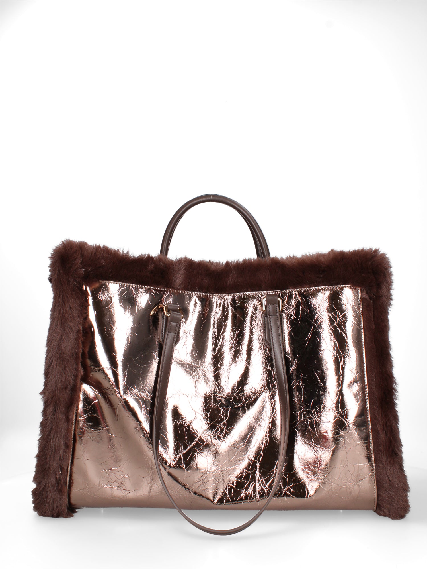 Struttura: Il corpo principale è ampio e rivestito completamente in shearling sintetico. I lati presentano una forma svasata che permette alla borsa di aprirsi verso l’alto, mentre la base larga ne garantisce stabilità. Gli Swarovski decorativi valorizzano il fronte con un effetto luminoso. Le zip laterali permettono di ampliare ulteriormente il volume interno.