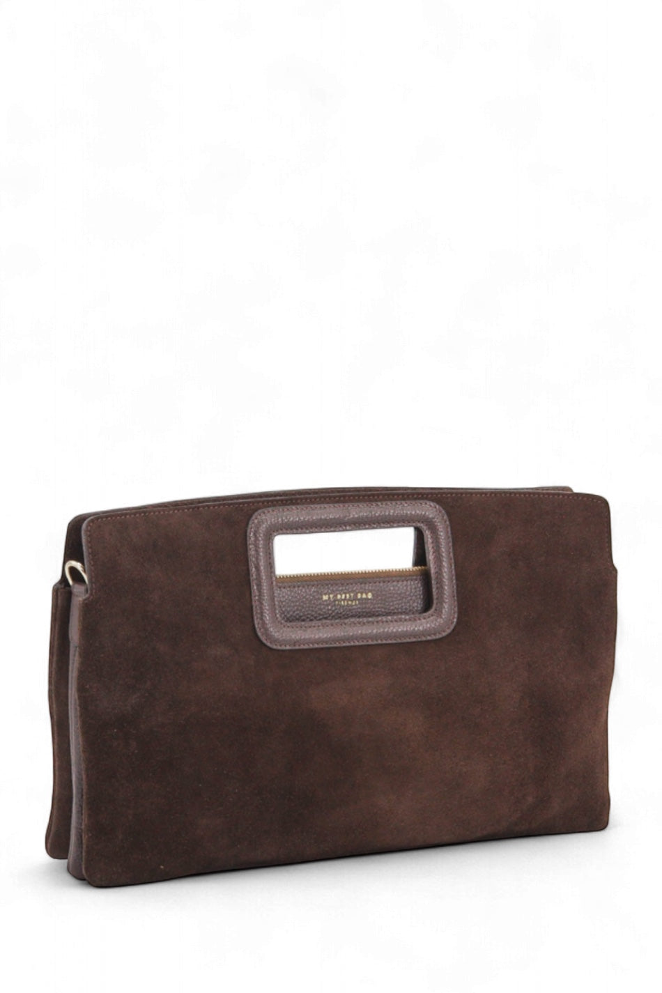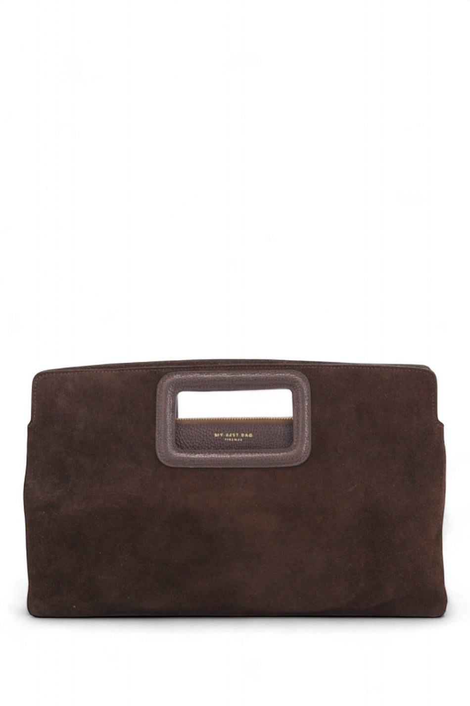 Il corpo principale è realizzato in suede, con profili e manico rigido integrato in pelle Dollaro. Il design presenta tre scomparti interni separati, che aumentano volume, ordine e praticità mantenendo una forma elegante e pulita.