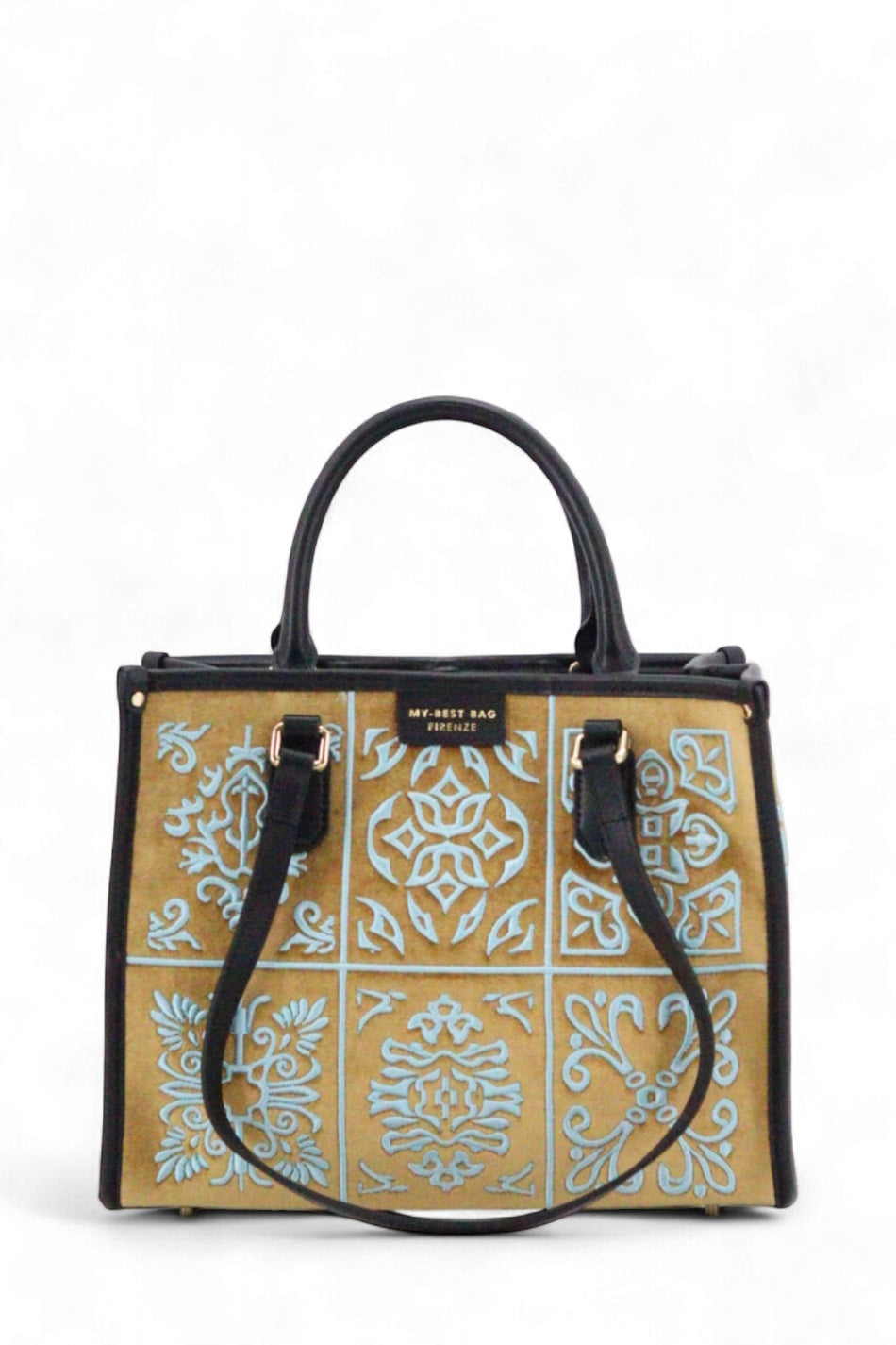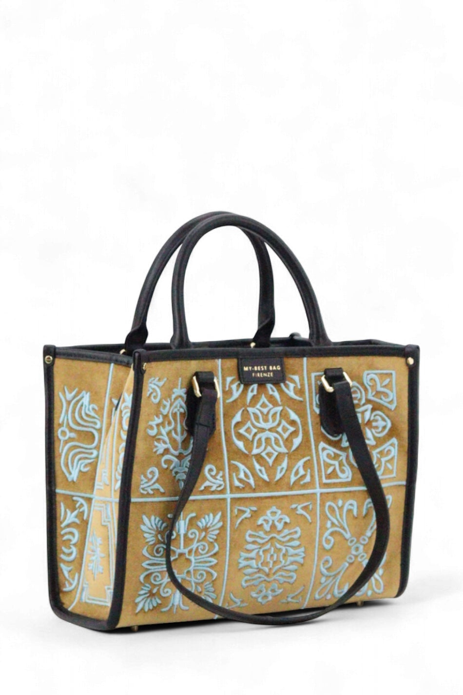Materiale: Realizzata in velluto con ricami a motivi stilizzati. I bordi, i manici e la tracolla sono rifiniti in vera pelle.