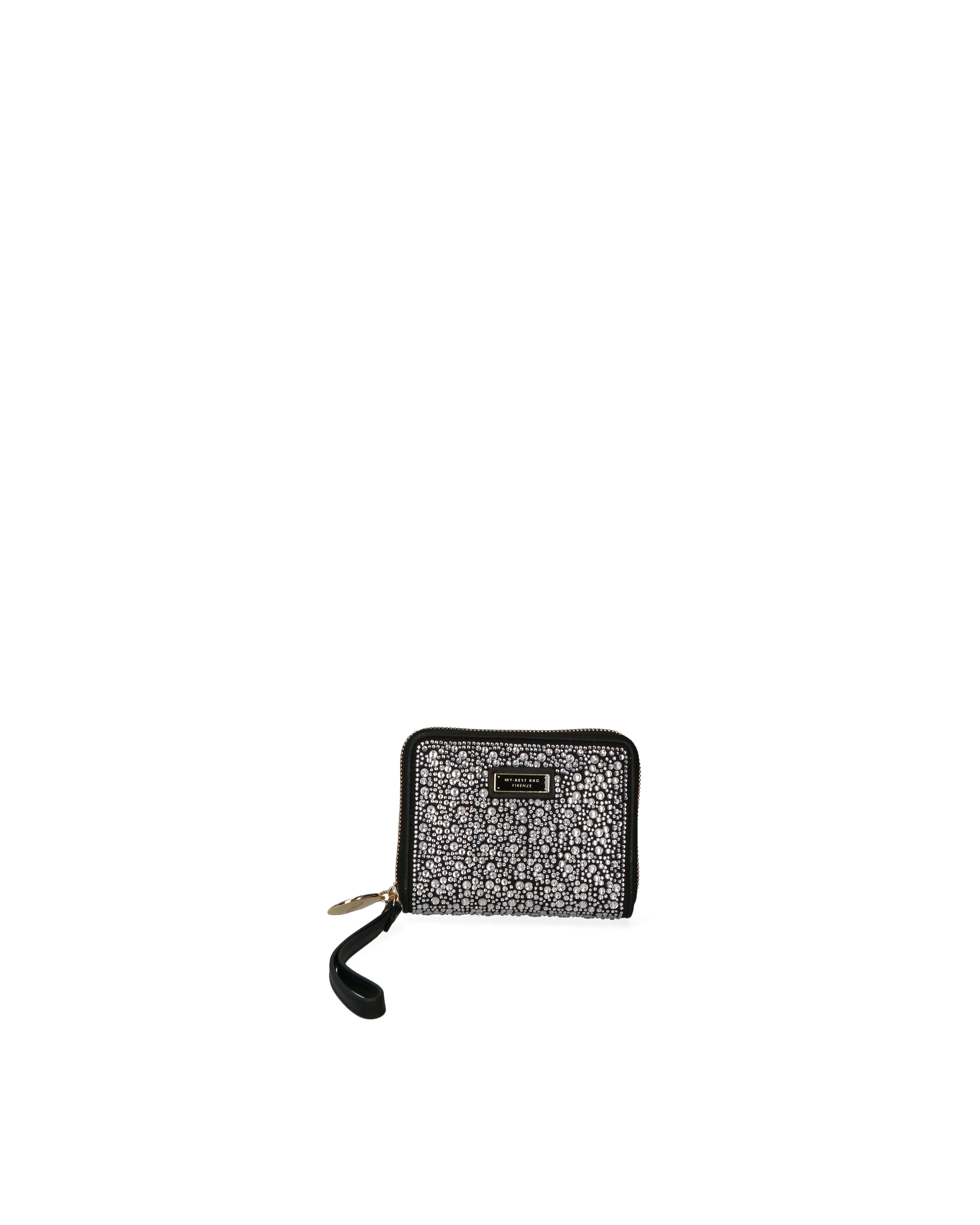 Compatto ma capiente, presenta chiusura zip con apertura totale e cinturino removibile al polso. Il design è elegante, arricchito dalla brillantezza dei cristalli.