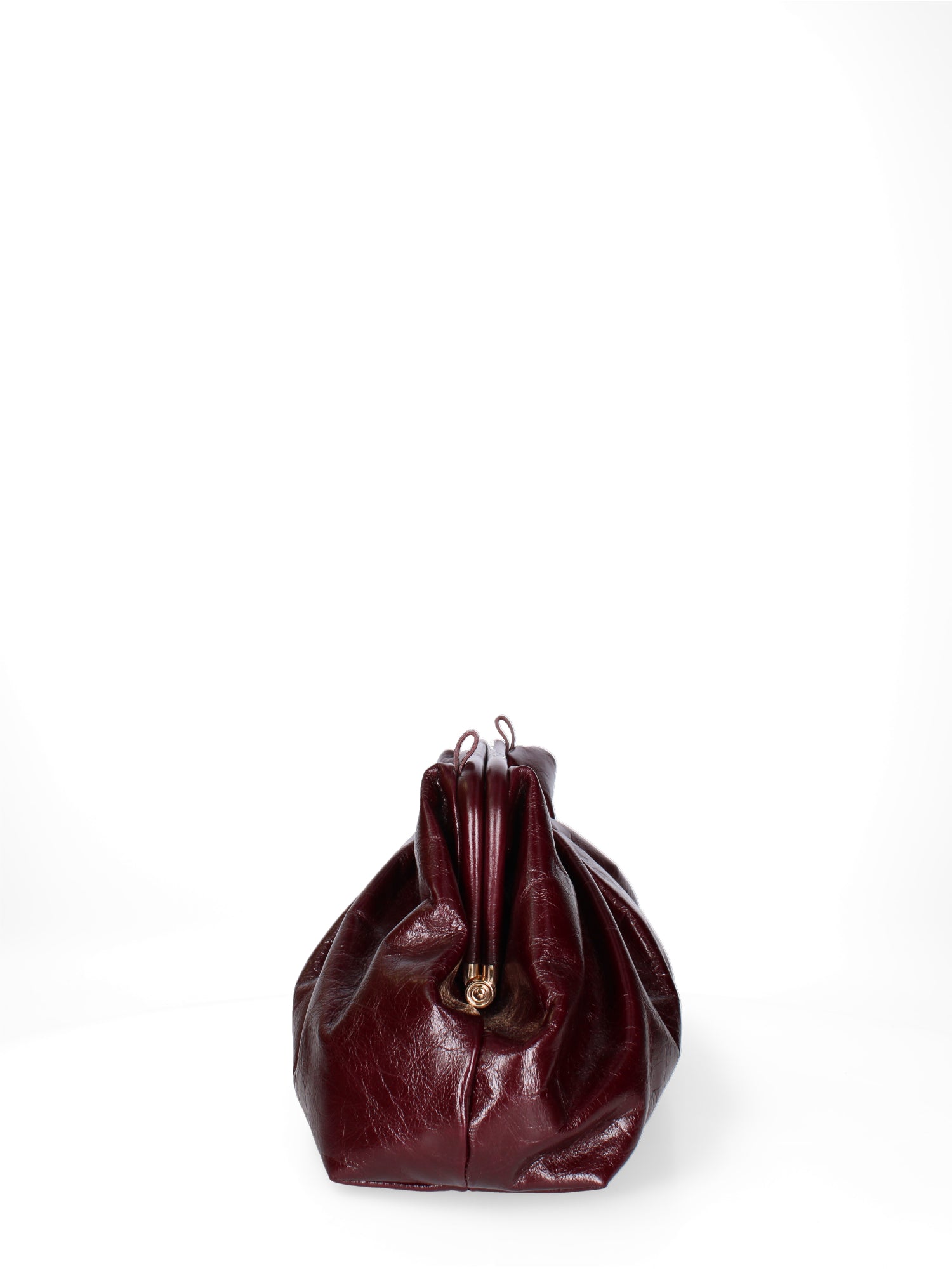 Questa borsa a mano o clutch presenta una forma arricciata morbida e ampia, che si sviluppa orizzontalmente.