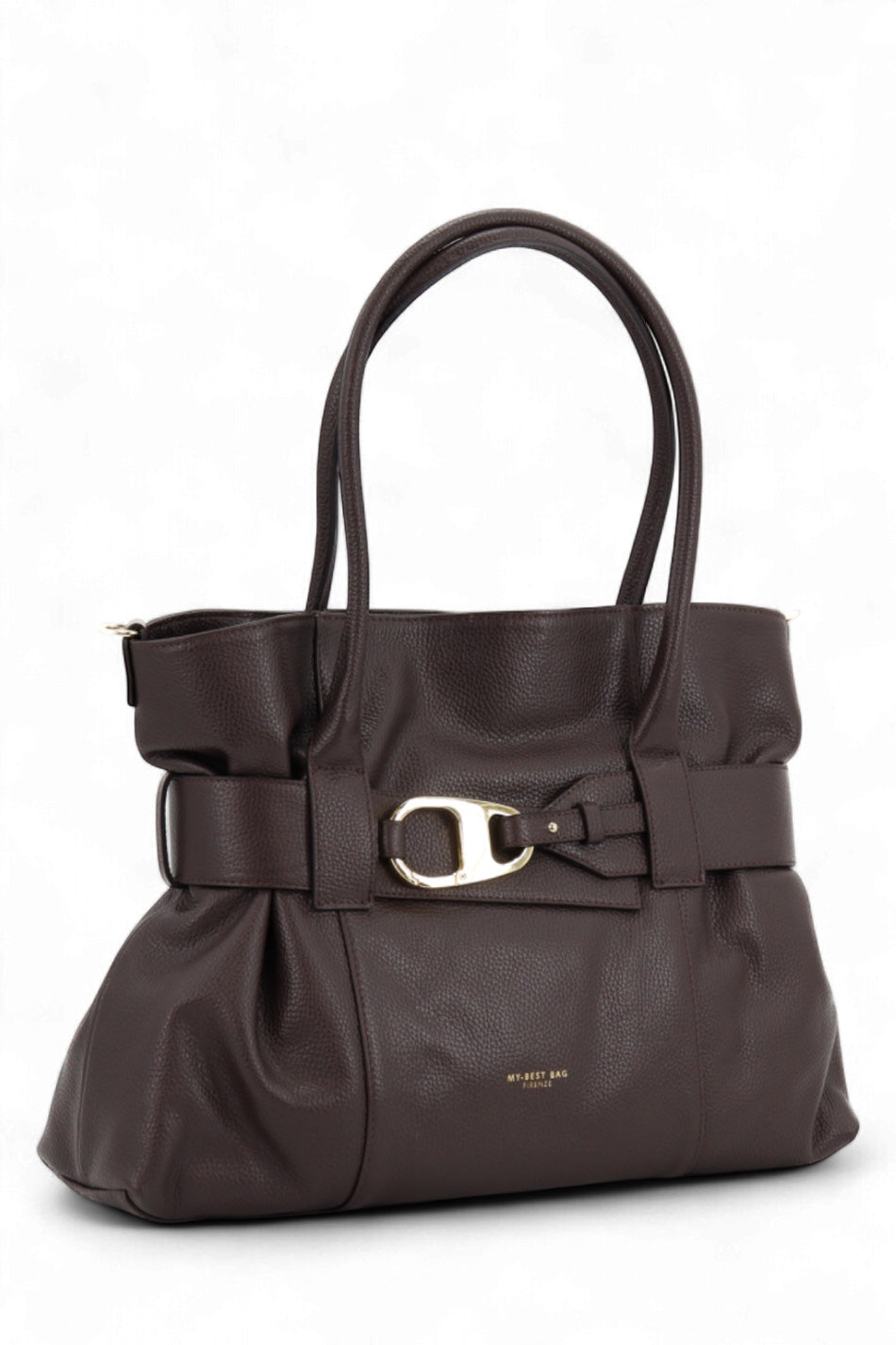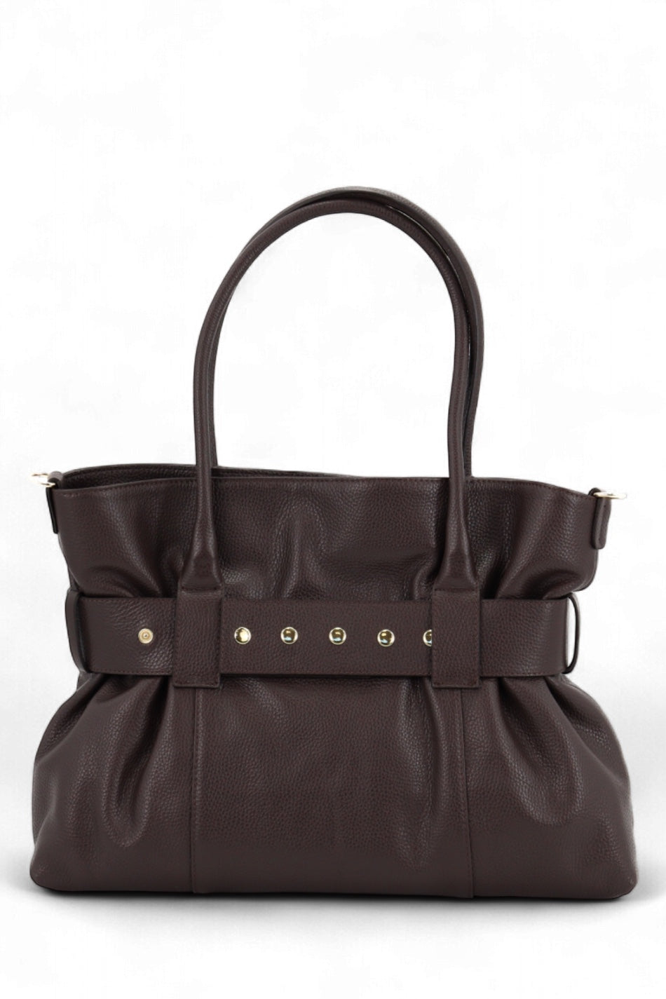Il corpo principale è morbido ma modellato, con pieghe laterali che donano volume e movimento. La fascia frontale in pelle, impreziosita dalla fibbia metallica decorativa, aggiunge carattere e definisce la silhouette.