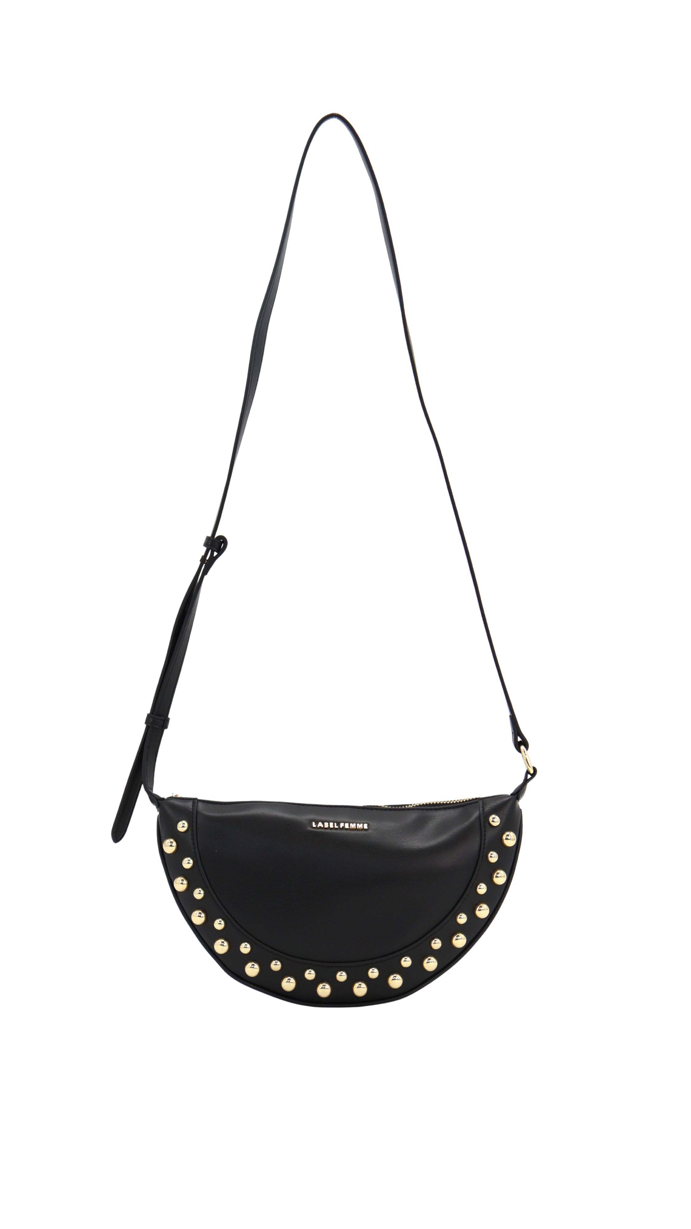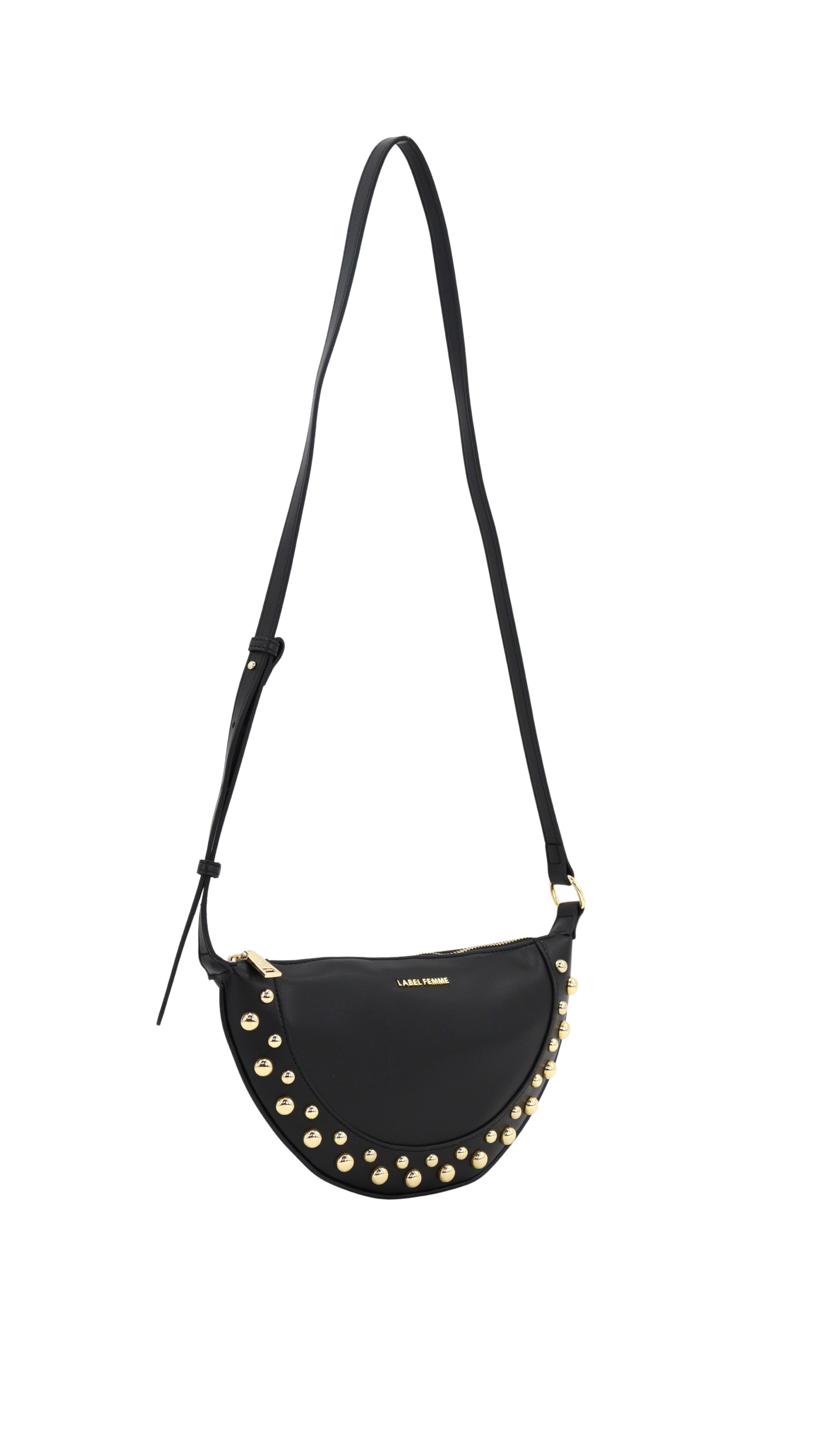 La borsa KATE è l’emblema di uno stile giovane e deciso. Realizzata in morbida pelle sintetica, si distingue per la sua forma a mezzaluna impreziosita da borchie dorate che aggiungono un tocco rock-chic al design essenziale.