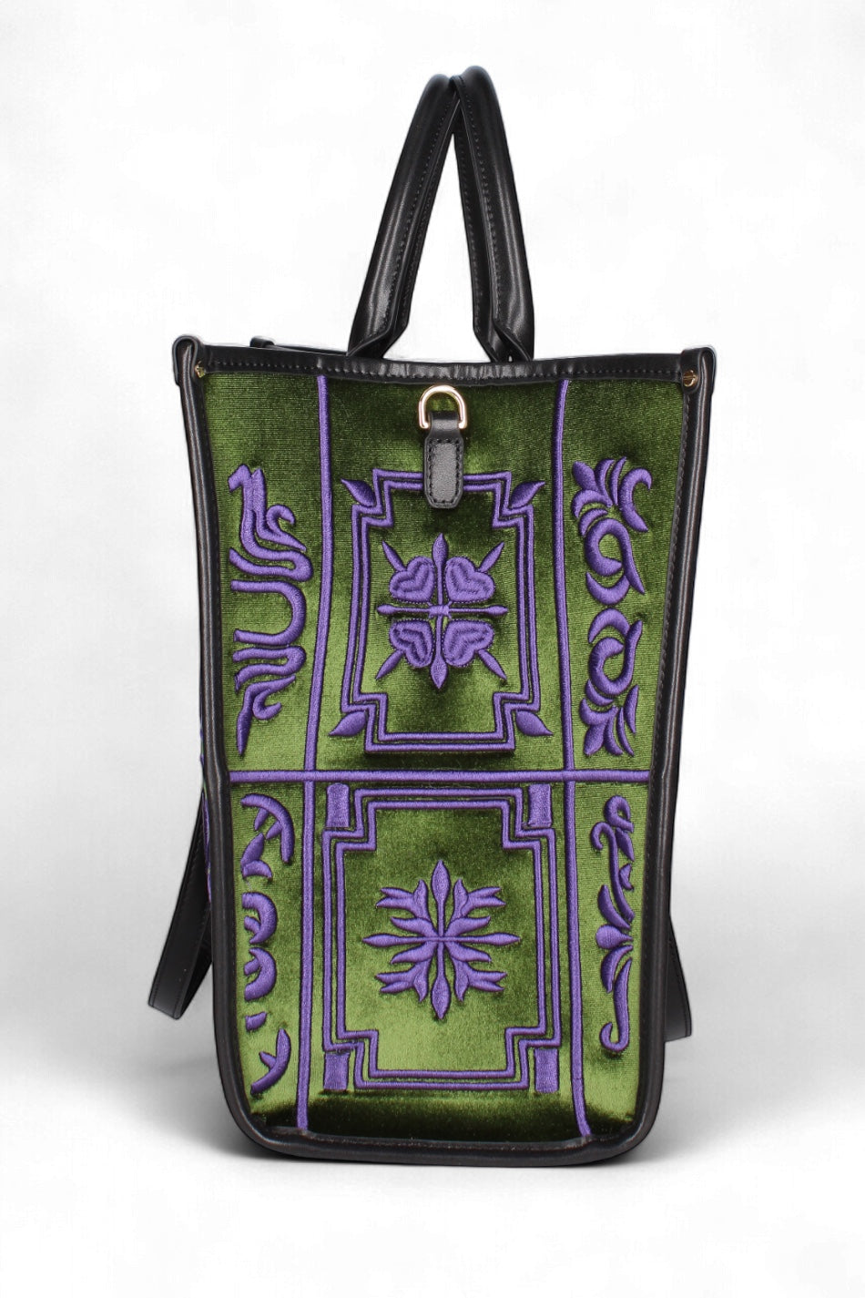Materiale: Realizzata in velluto con ricami a motivi stilizzati. I bordi, i manici e la tracolla sono rifiniti in vera pelle.