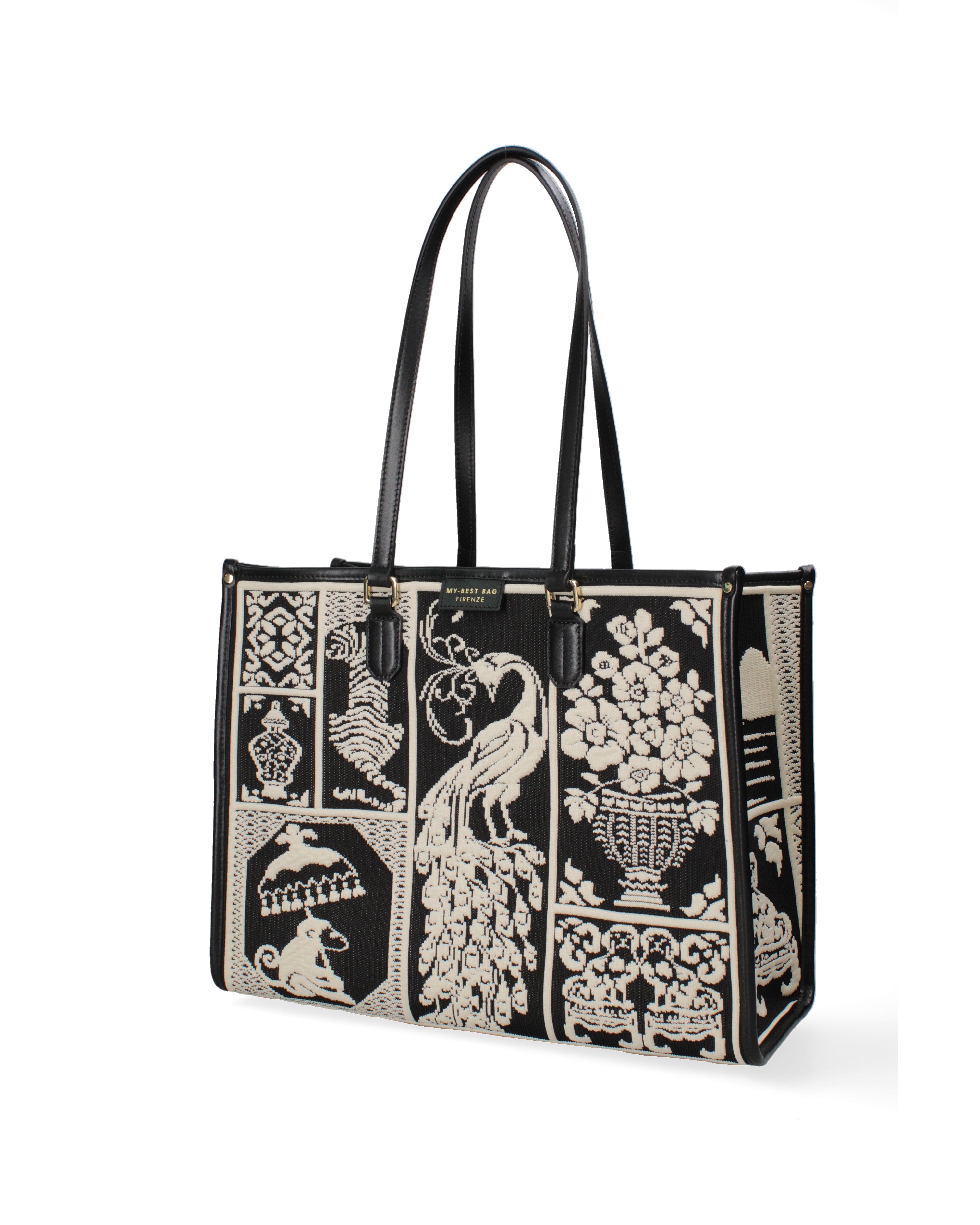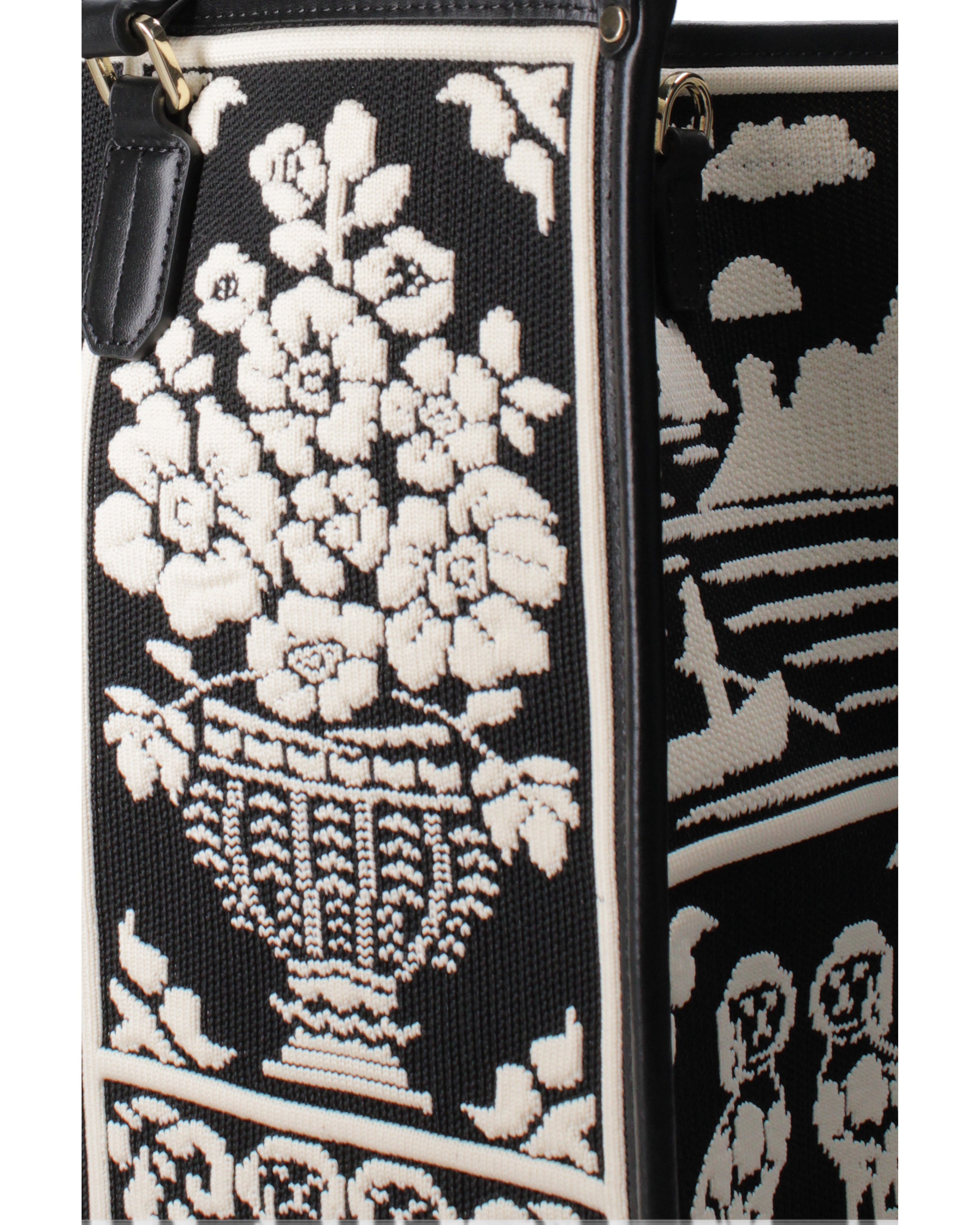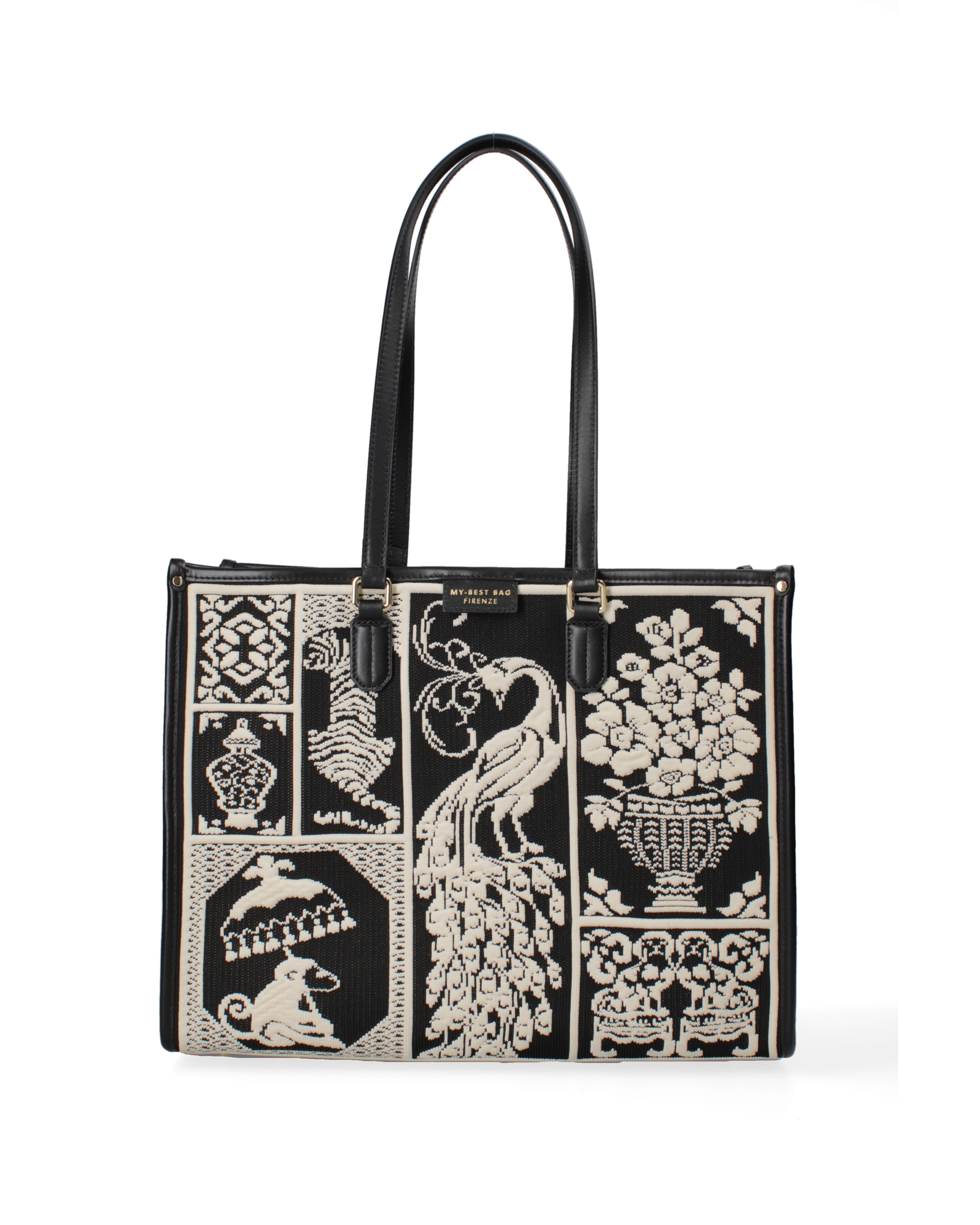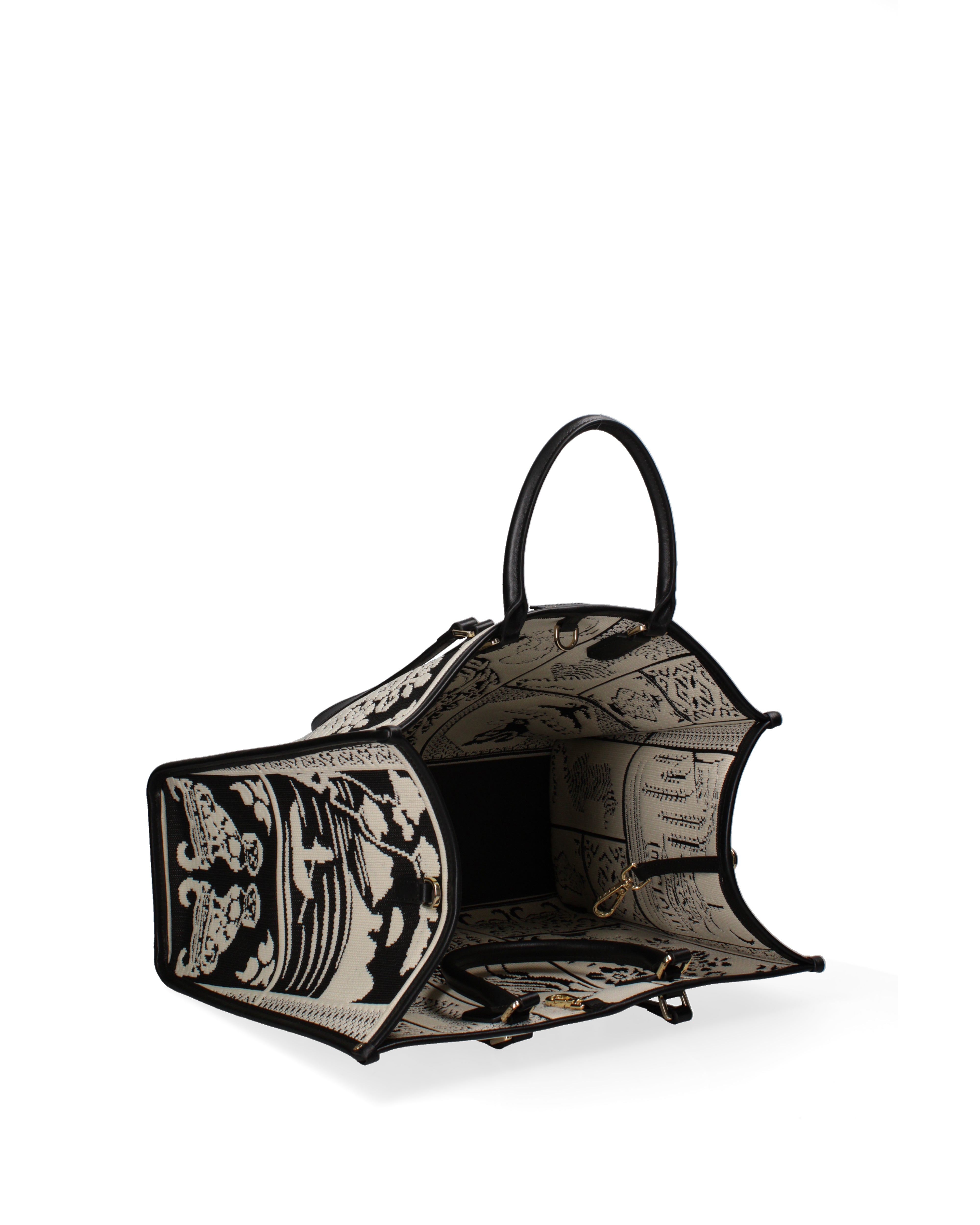 La borsa "Atena Willow" cattura l'attenzione con il suo design unico e raffinato, perfetto per chi ama distinguersi con stile. L'elaborata lavorazione jacquard, con motivi ispirati alla natura e all'arte, crea un contrasto affascinante con il fondo nero, conferendo alla borsa un'aura di eleganza senza tempo.