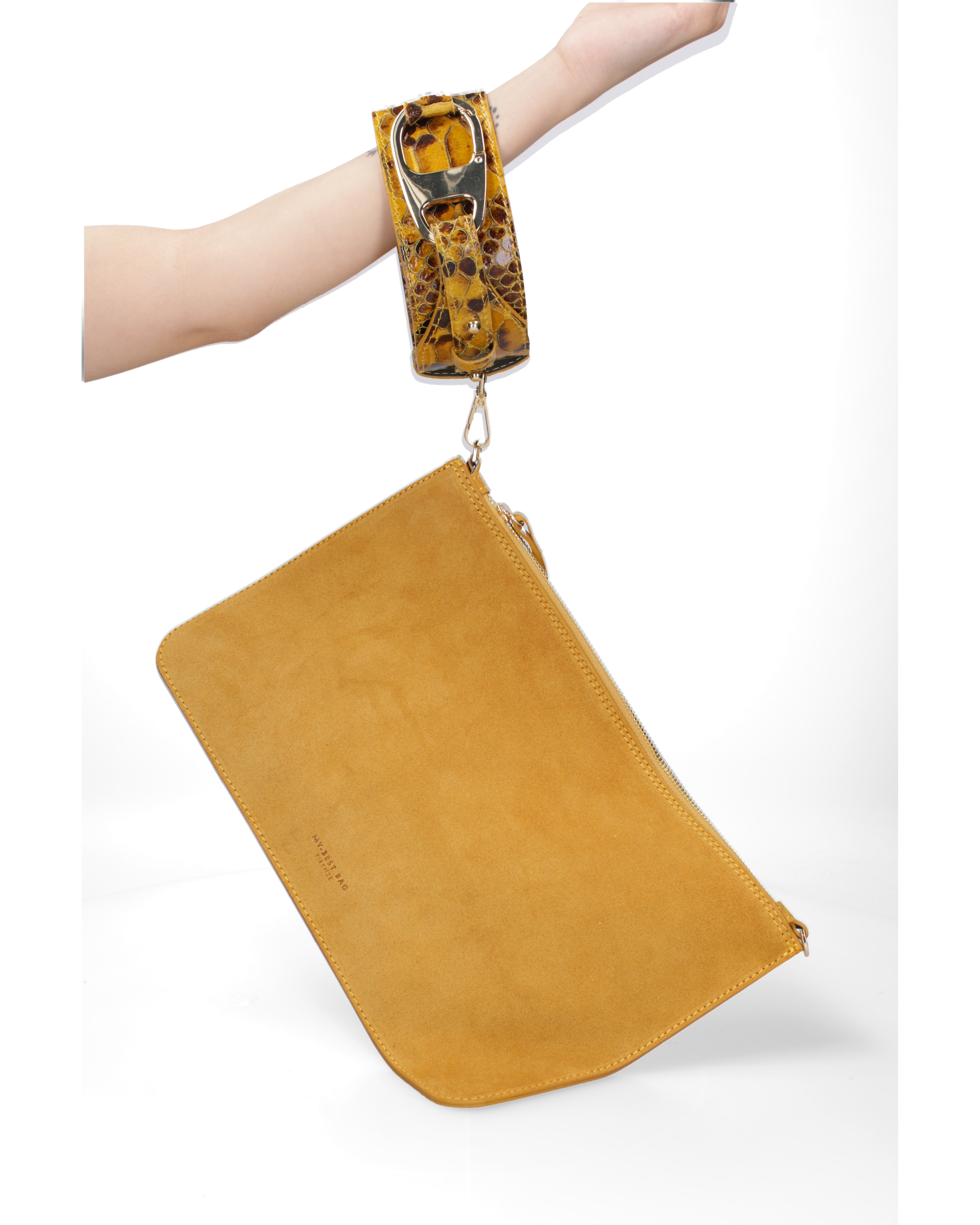Materiale: Realizzata in pelle scamosciata, con bracciale removibile in pelle pitonata e dettagli metallici.