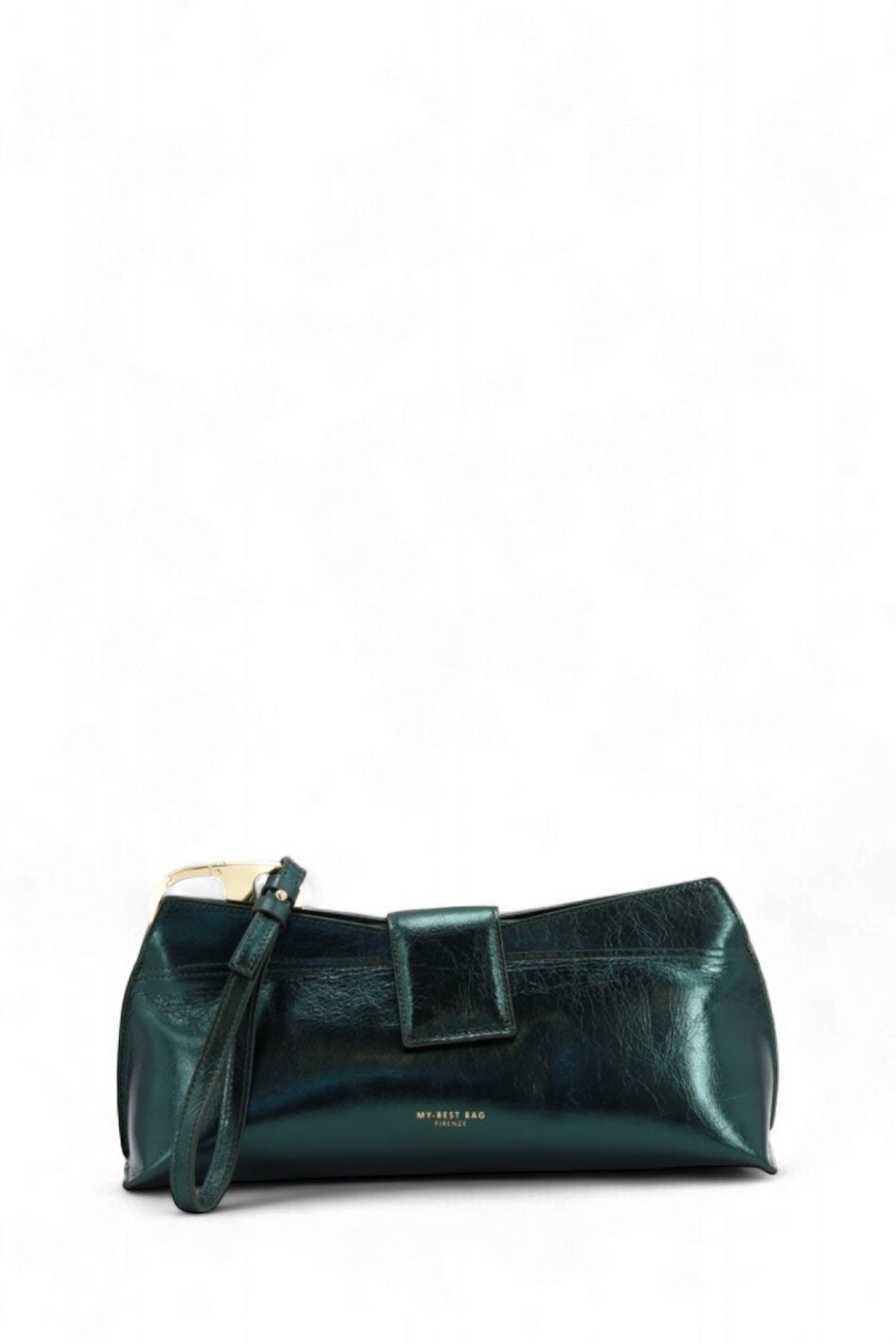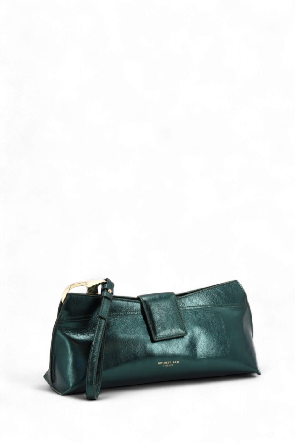 Materiale: Realizzata in pelle metallizzata con texture luminosa e sofisticata. La pelle rigida mantiene la forma della borsa, mentre la chiusura con pattina centrale aggiunge un tocco iconico al design.