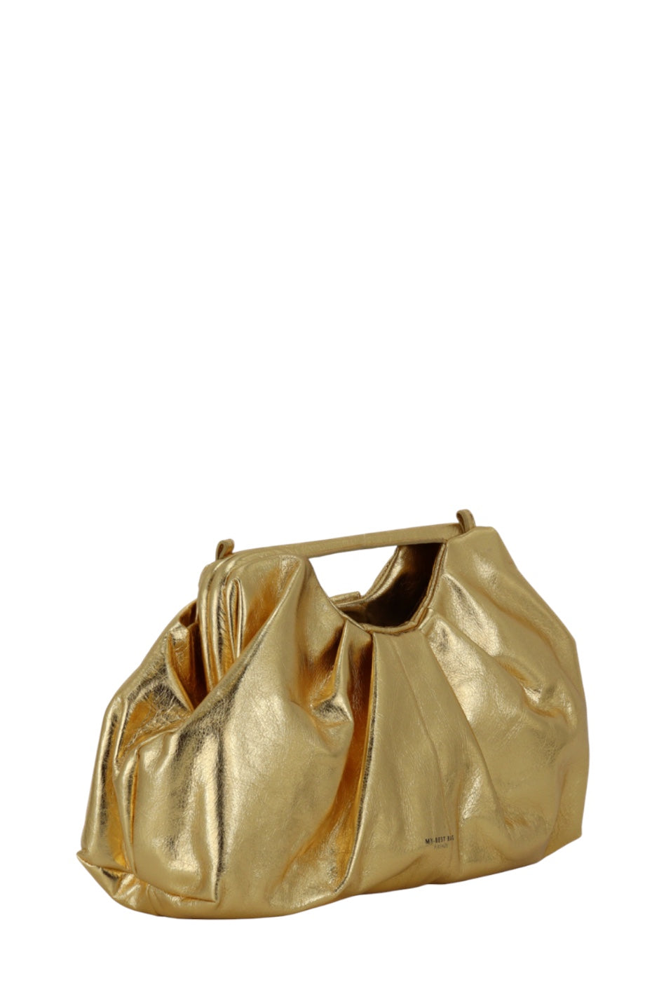 Questa pochette dal design morbido e sofisticato è perfetta per chi desidera un accessorio distintivo, elegante e luminoso grazie alla sua finitura in pelle metallica.