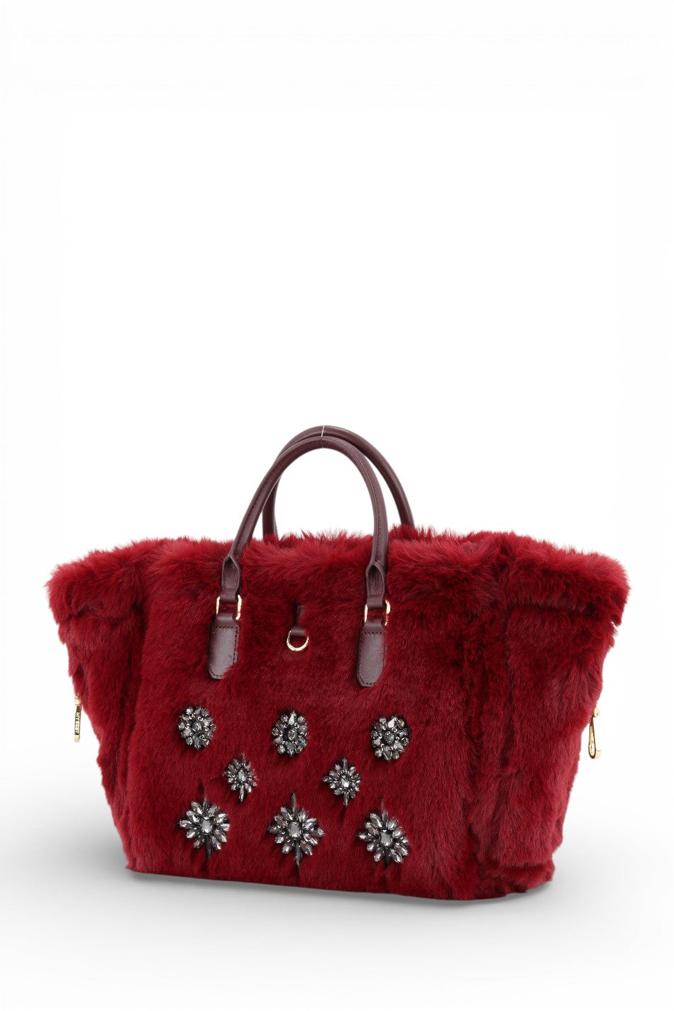 Struttura: Il corpo principale è soffice e definito, con lati leggermente svasati che migliorano la capienza. Il modello è reversibile, utilizzabile sia dal lato shearling che dal lato pelle metallizzata. Le applicazioni Swarovski donano brillantezza al fronte e le zip laterali permettono di ampliare l’apertura superiore.