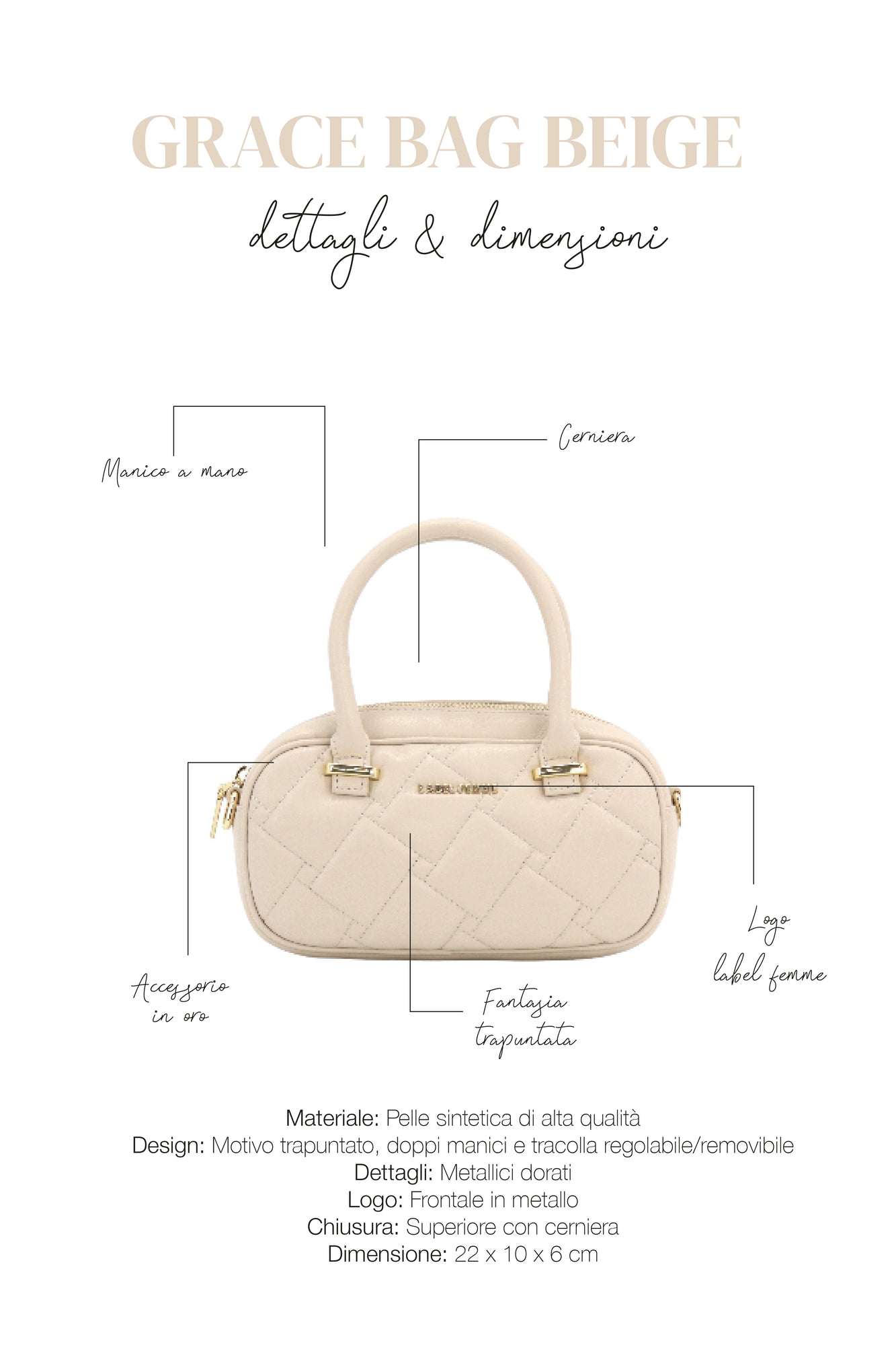 La borsa GRACE è un piccolo gioiello di eleganza e stile, perfetta per completare ogni outfit con un tocco raffinato. Realizzata in morbida pelle sintetica trapuntata, presenta una silhouette compatta dalle linee pulite e moderne.