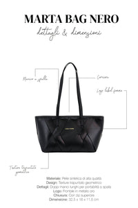 La shopper MARTA combina eleganza e praticità in un design moderno e raffinato. Realizzata in morbida pelle sintetica trapuntata con motivo geometrico, è l’accessorio ideale per accompagnarti in ogni momento della giornata.